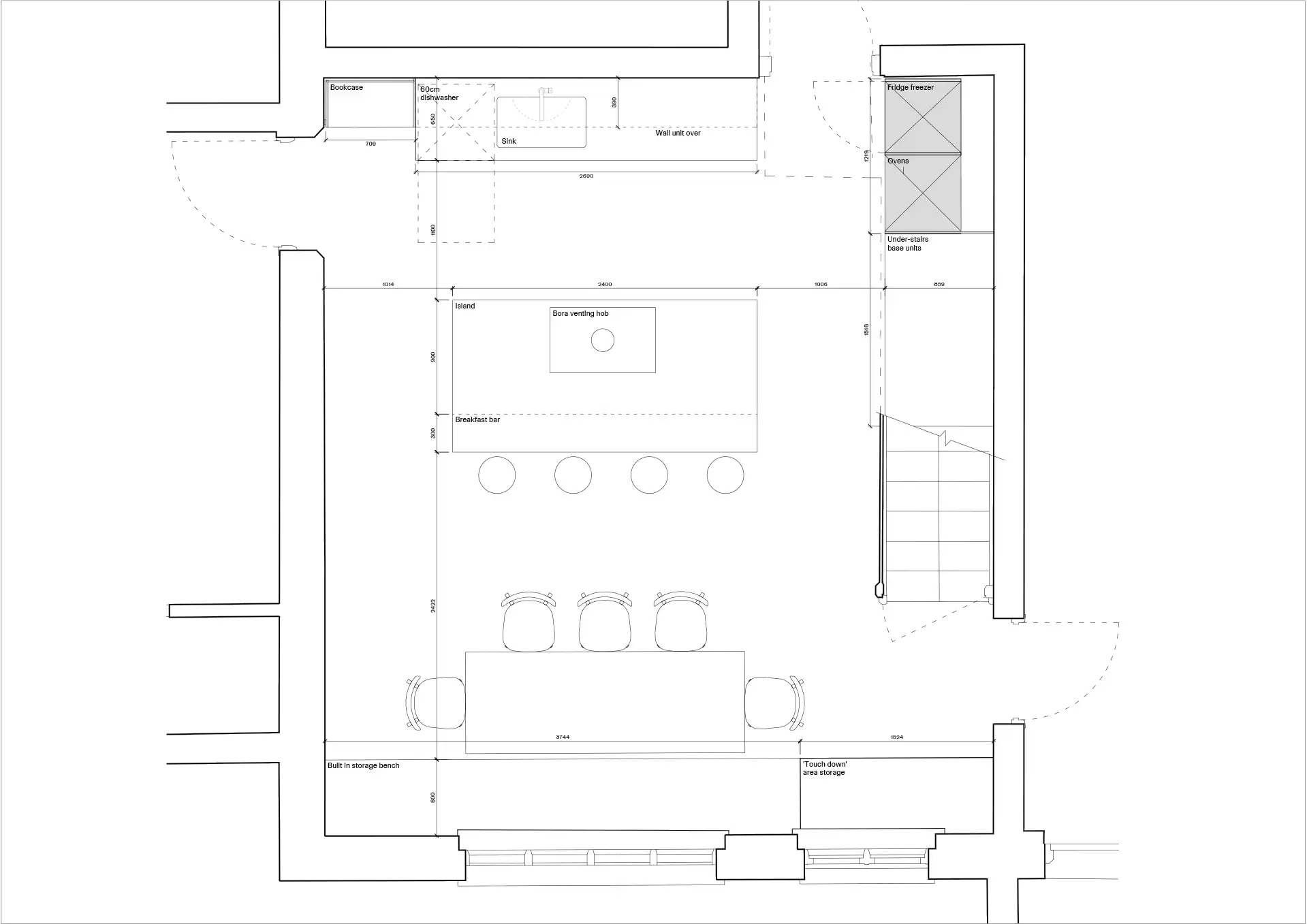 Working with architects Theis and Khan, the clients removed the chimney entirely, which was an inspired decision that unlocked the room’s potential and allowed us to introduce a central island and cabinetry beneath the staircase. Early discussions focused on whether the island should hold the sink or the hob. We often advise that the sink (typically the messiest zone) is placed against the wall, leaving the island for cooking as a more engaging, social focal point.