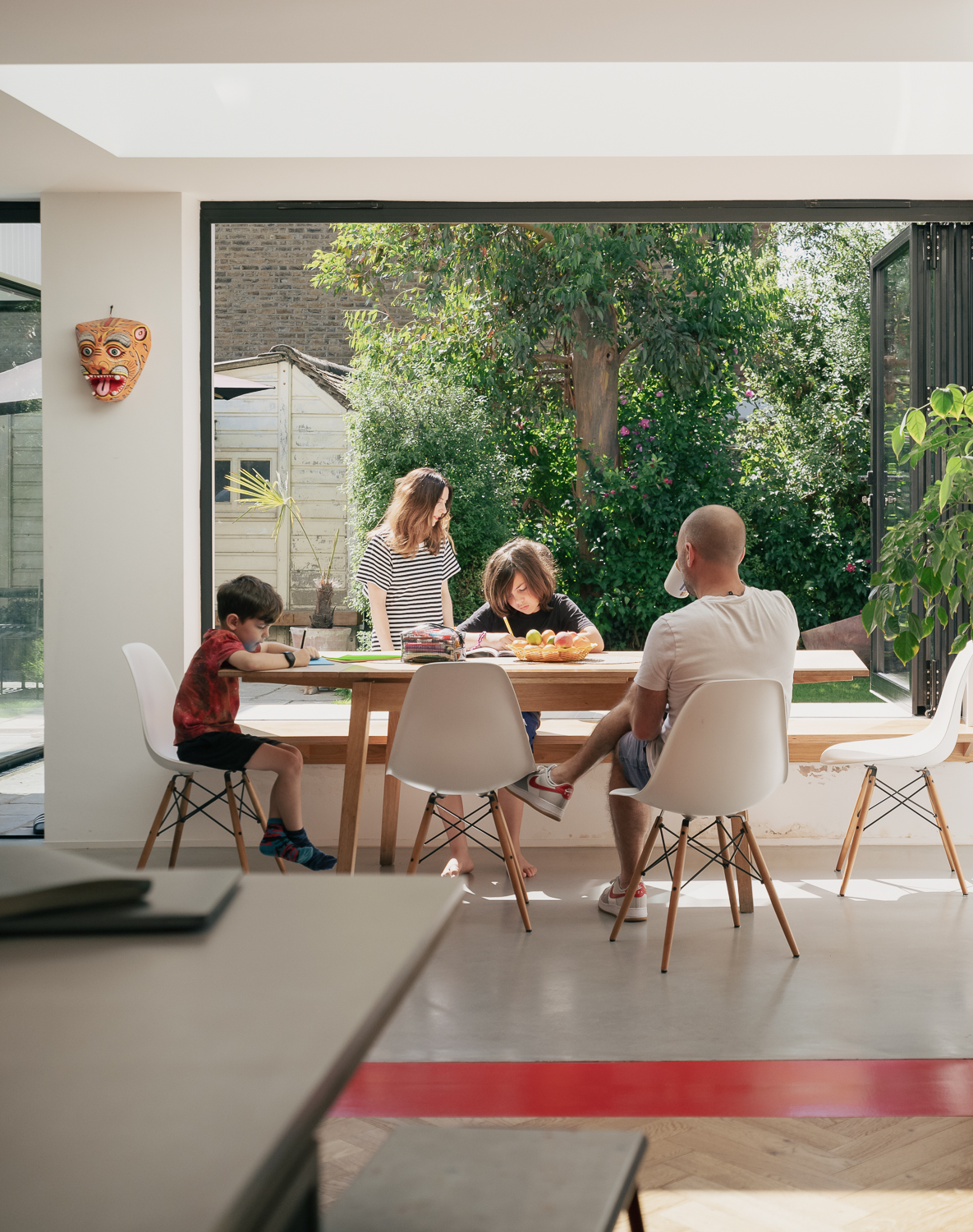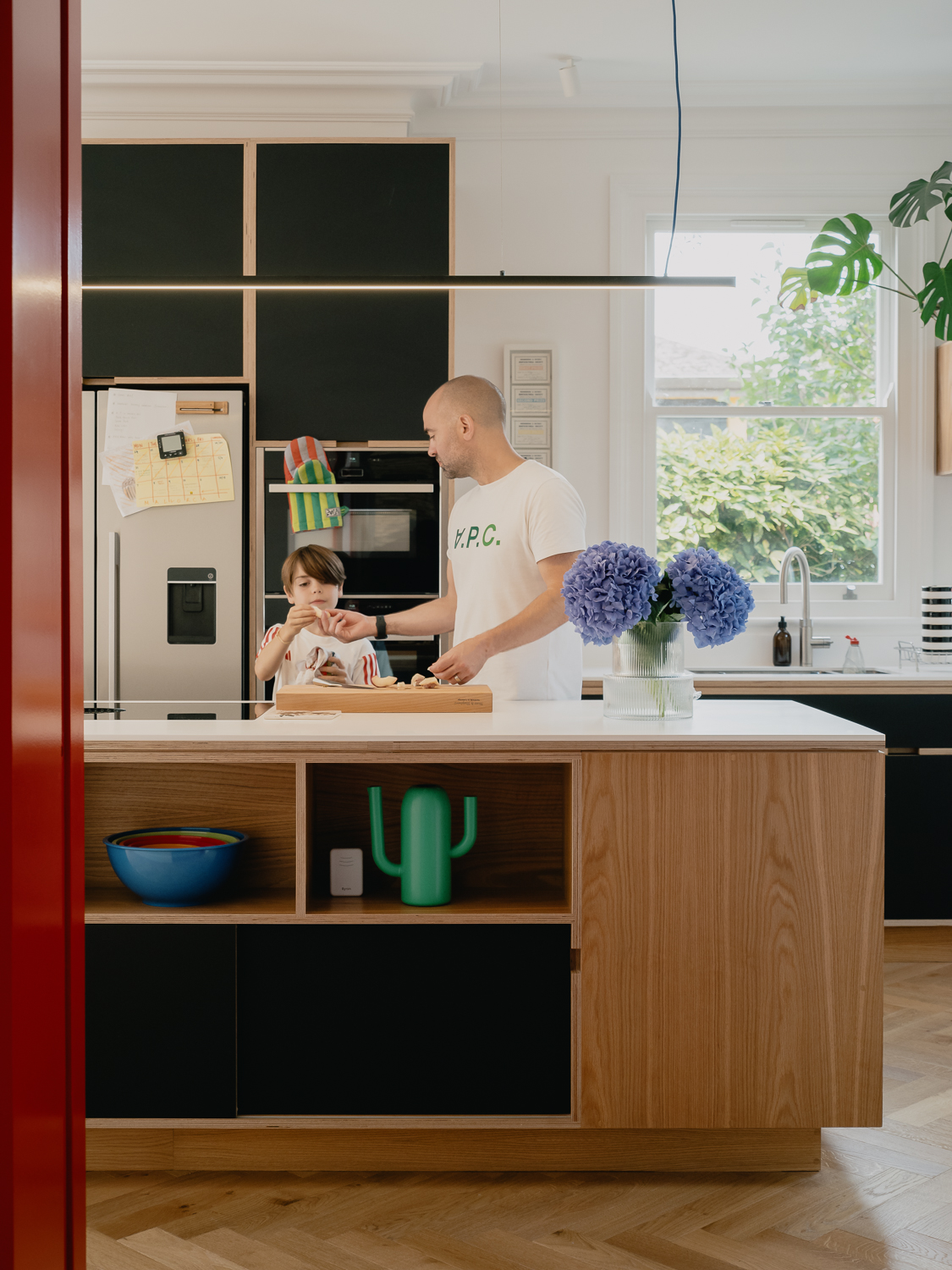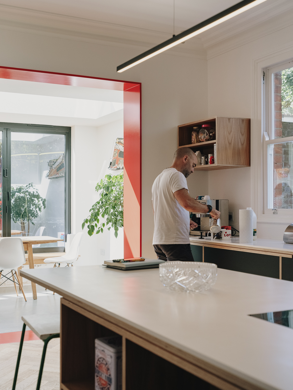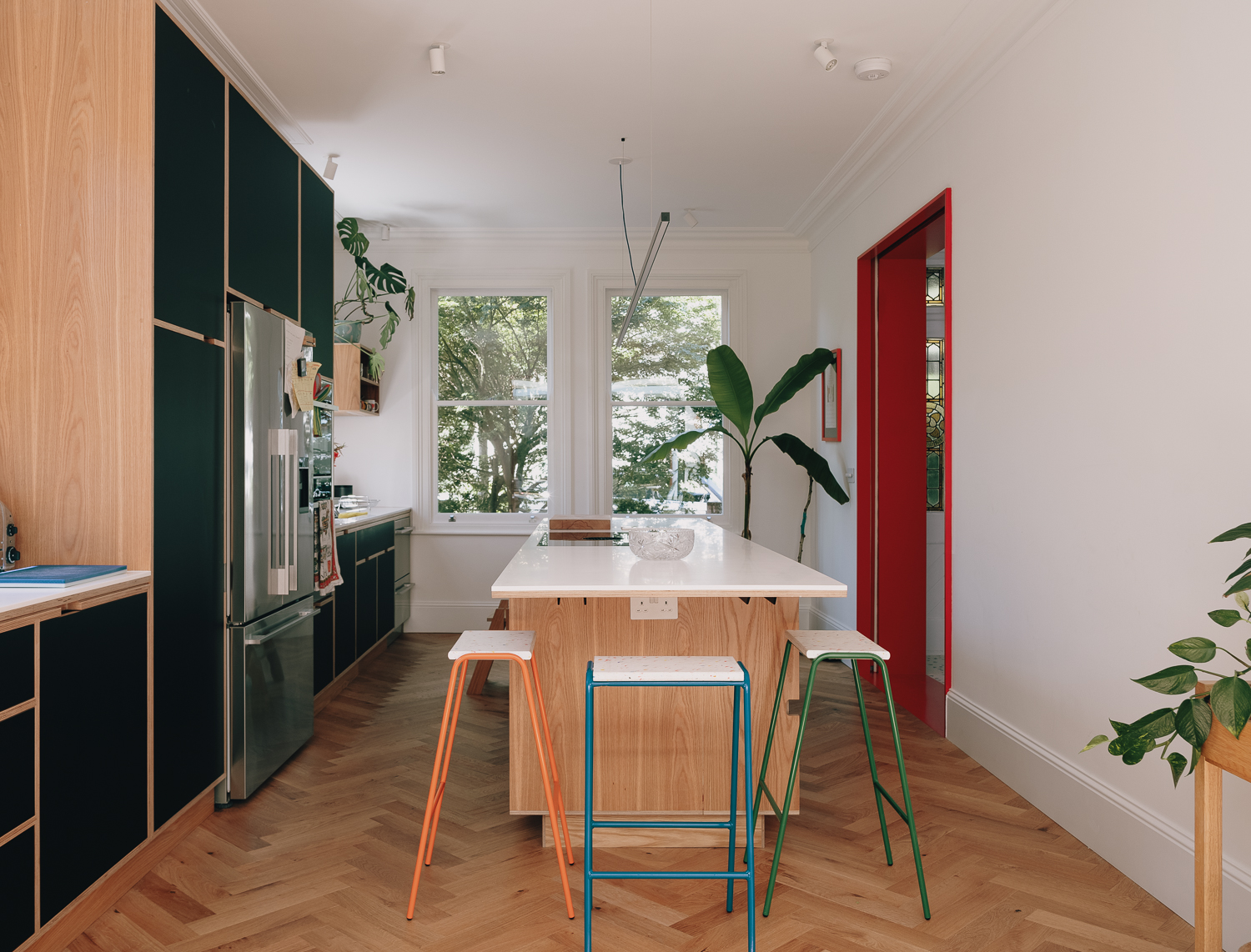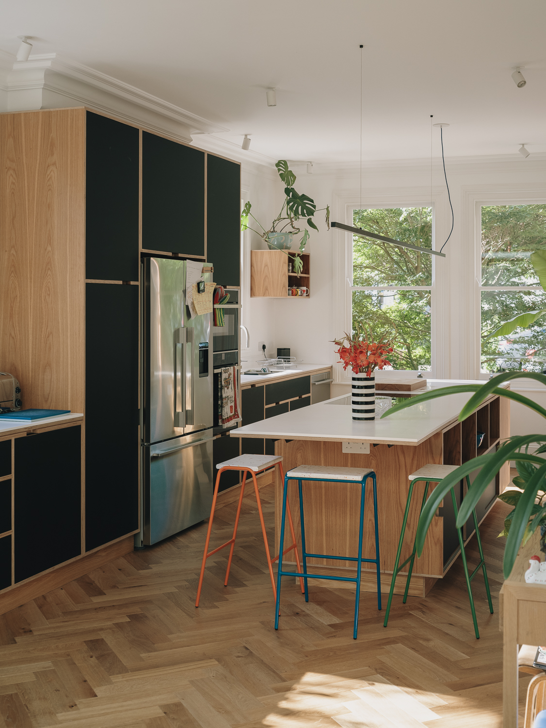 Below, the base cabinetry was split into two functional zones: one side for washing, bins and dishwasher; the other a dedicated breakfast and coffee station. By resisting the urge to place cabinets in front of the front-facing windows, we preserved the room’s openness and created a more efficient galley-style layout. In the adjacent dining area, we installed a cantilevered plywood window seat, which helps connect the two spaces.