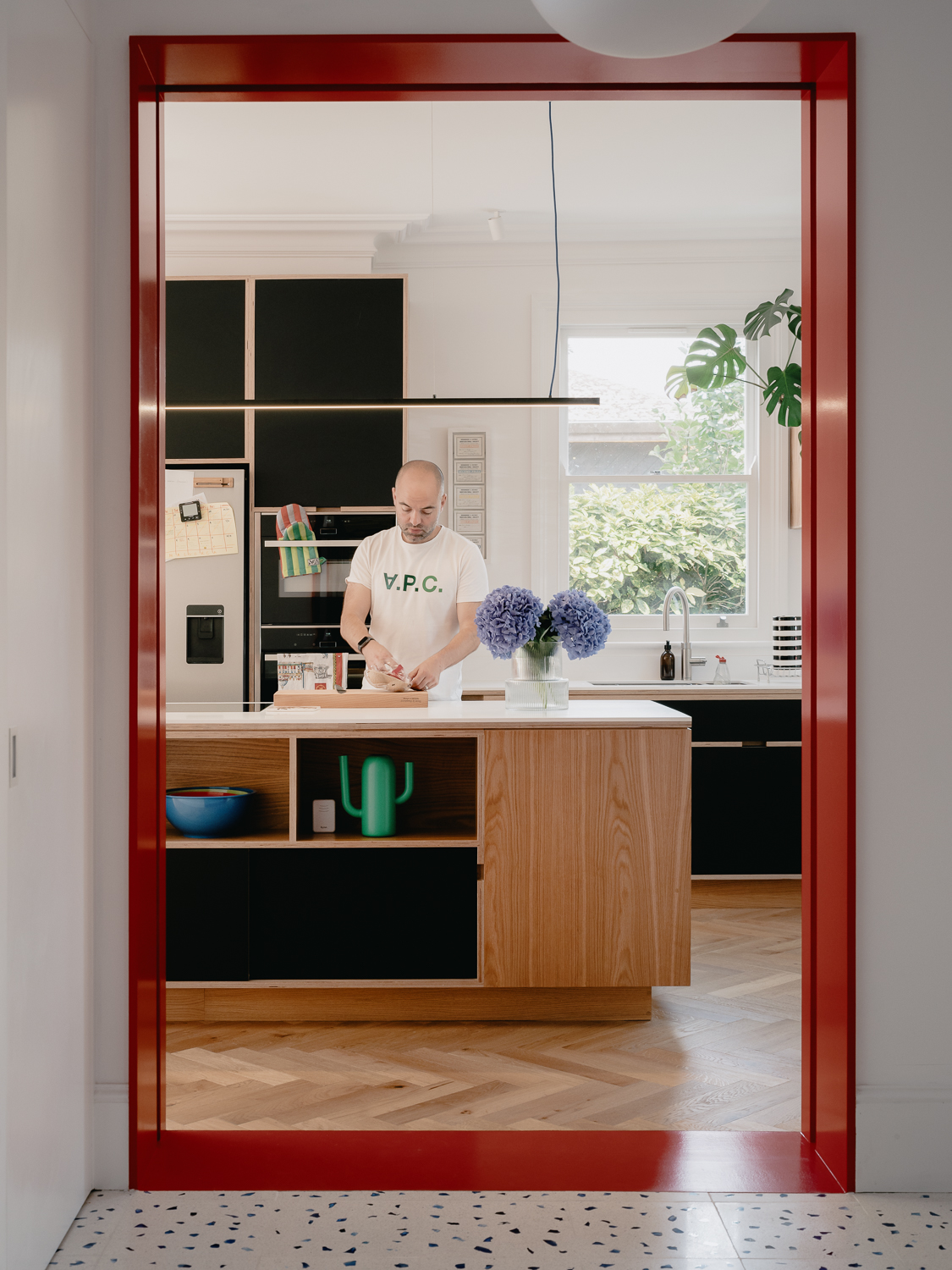 A restrained palette of ultra-matt black laminate and oak-veneered birch plywood ties the cabinetry to the architecture, complementing the red structural portals while offering contrast and warmth. White Corian worktops keep the space bright and practical.